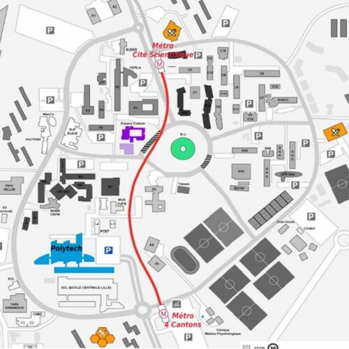 Once at the roundabout next to the station ” 4 Cantons – Stade Pierre Mauroy”, go straight to the enter of the Polytech Lille parking.